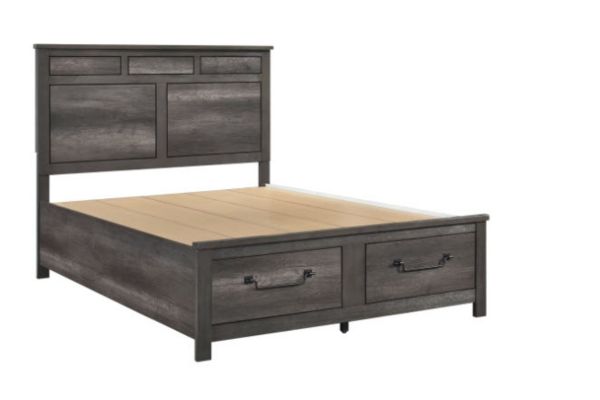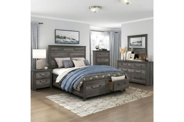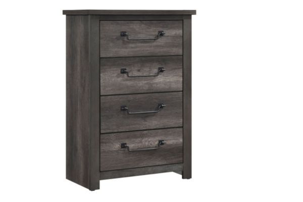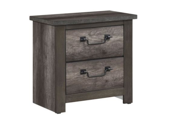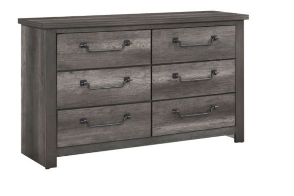 This collection combines rustic, industrial, and transitional design for a timeless bedroom look. Finished in durable gray melamine laminate with a realistic wood texture, it offers excellent resistance to scratches and stains. Gunmetal-tone drop handles add an industrial accent, while dovetail drawers and sturdy construction provide long-lasting functionality.
