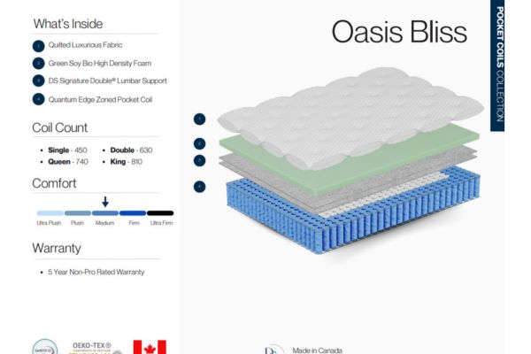 The Dreamstar Oasis Bliss (often referred to as the Orthopedic Deluxe in some collections) is a Canadian-made, budget-friendly hybrid mattress designed for balanced support and pressure relief. It is commonly sold as a “Mattress in a Box,” making it easy to transport and set up. This model is ideal for guest rooms, first-time buyers, or those who prefer a standard-height hybrid with easy transport options.