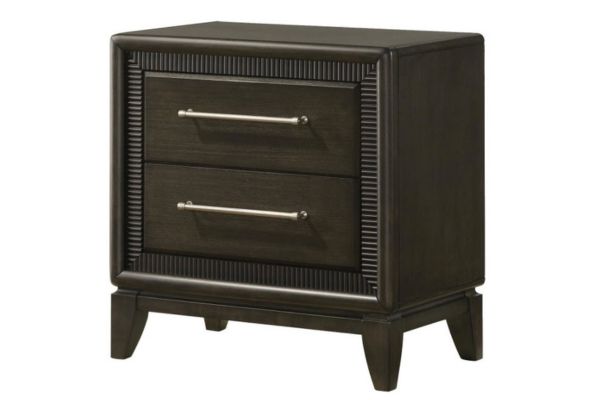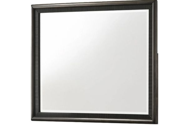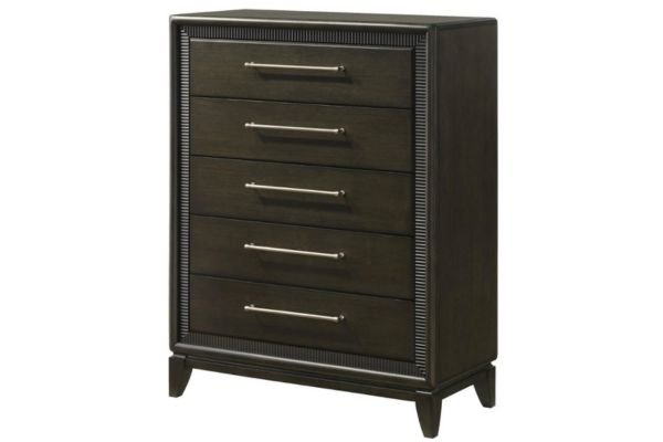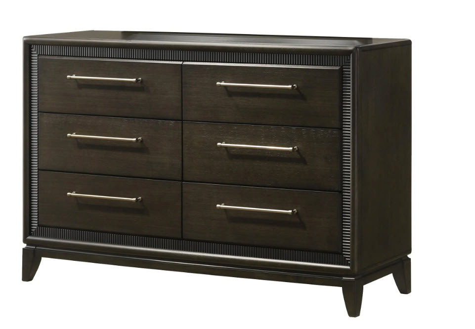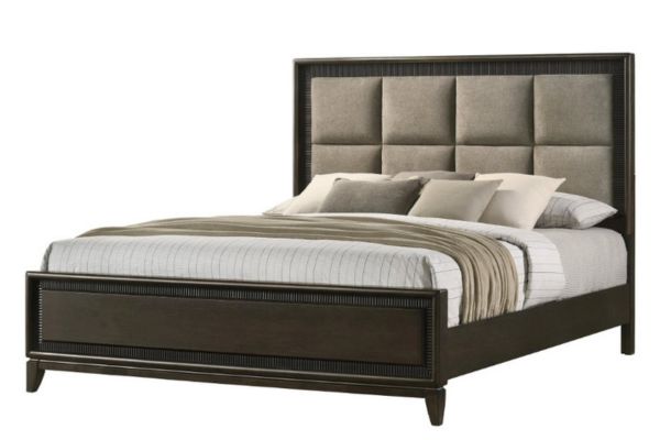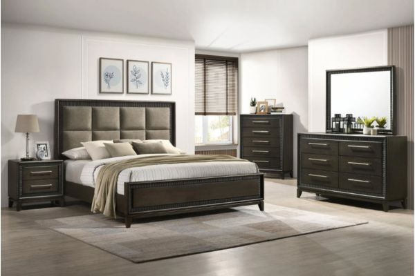 This contemporary bedroom set boasts a sophisticated aesthetic, characterized by its deep espresso finish that speaks to modern tastes. The clean-lined bed features an elegantly tufted headboard, offering both comfort and style, and is complemented by streamlined nightstands and a dresser with a sleek, matching mirror. The brushed metal hardware provides a subtle contrast, highlighting the set’s chic and urbane design.