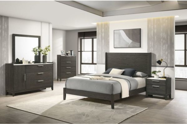 Elevate your bedroom with this stylish and functional bedroom set in a sleek dark grey finish. Designed with a modern aesthetic and practical features, this set includes everything you need for a cohesive and elegant look. Each piece features thoughtful details, durable construction, and a touch of sophistication with faux marble accents on select furniture.