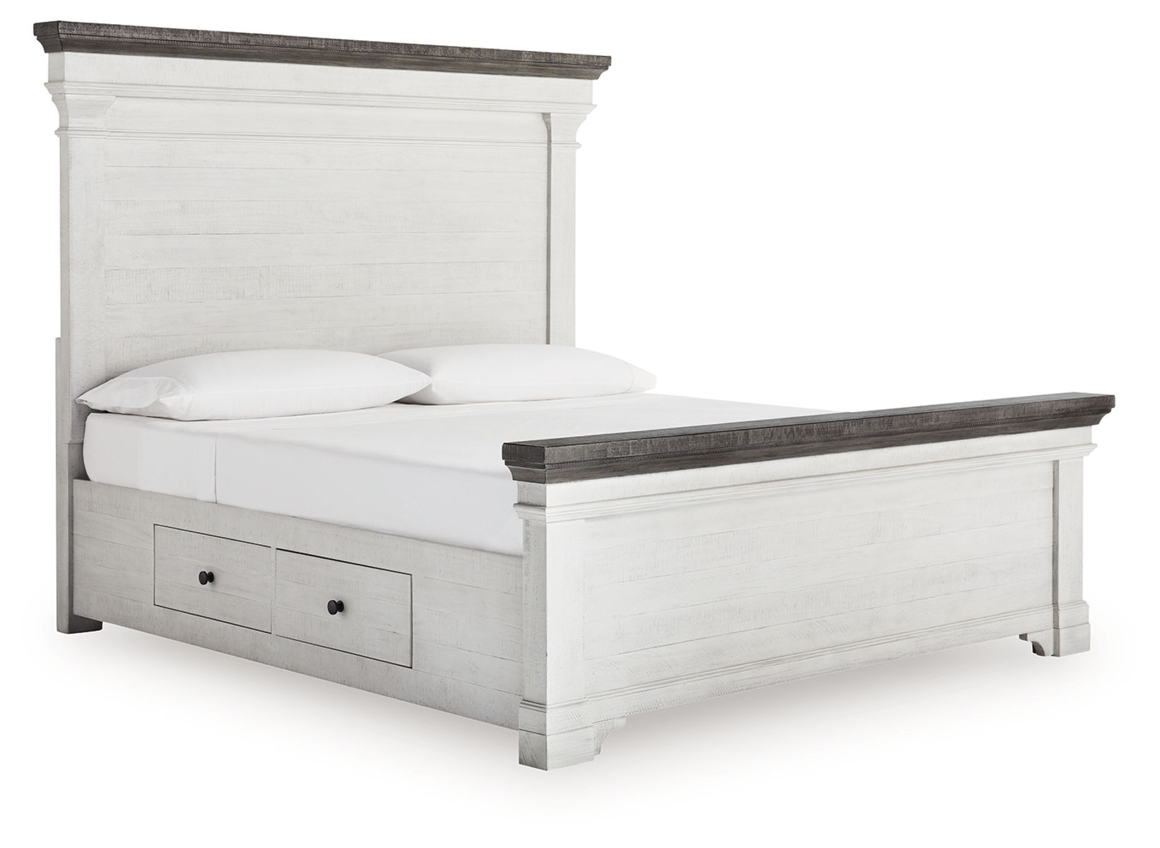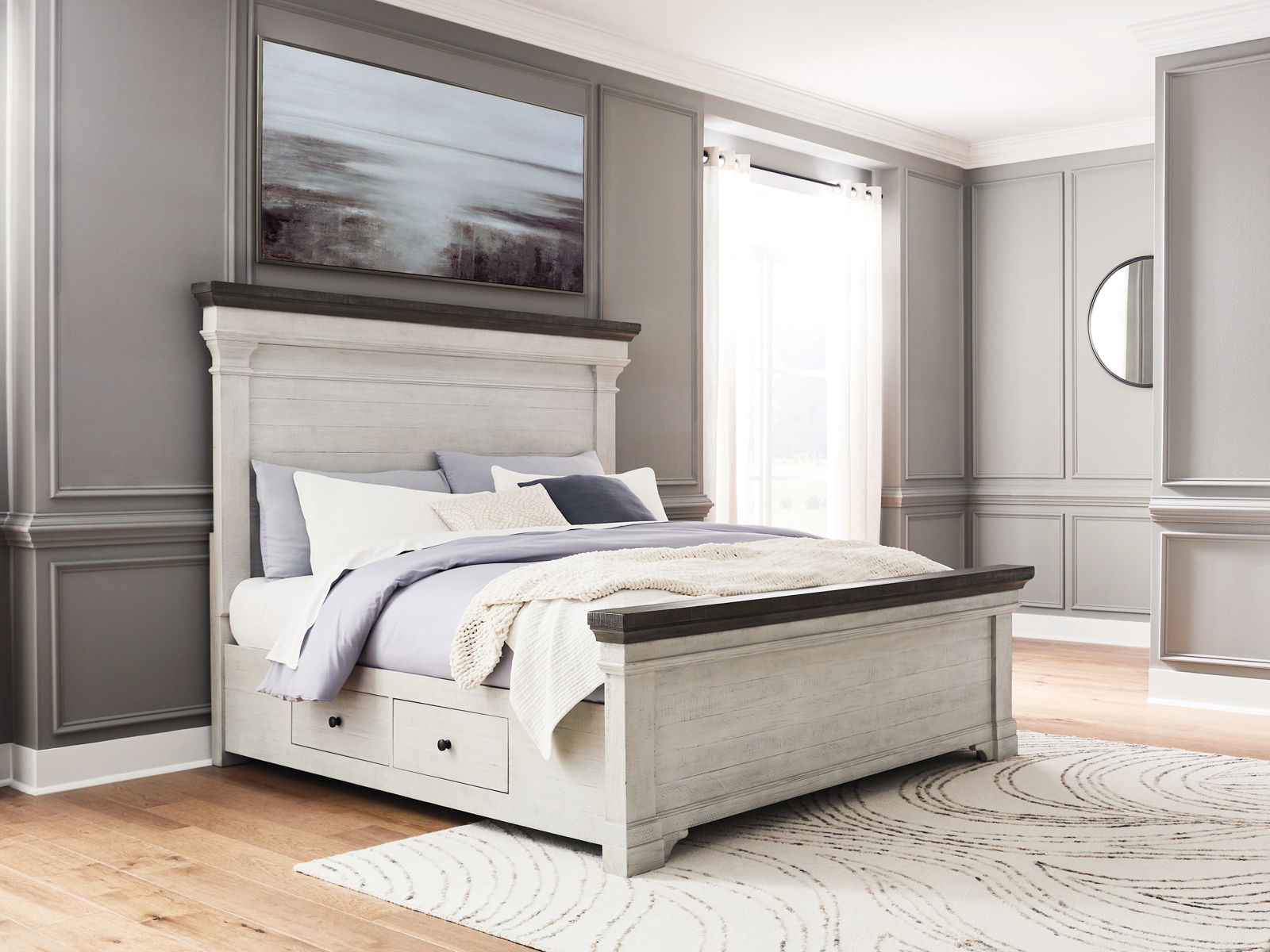 What a fresh interpretation of country classic style. Inspired by American farmhouse craftsmanship, but with an elevated sensibility, this queen panel storage bed blends distinctive details—such as wide plank post accents and a tall mansion-style headboard—for a substantial look that feels right at home. Those who appreciate rustic character should take note of this bed’s thick-profile crown moulding, beautified with a vintage two-tone finish. Two handy storage drawers flawlessly integrate traditional style with modern convenience.