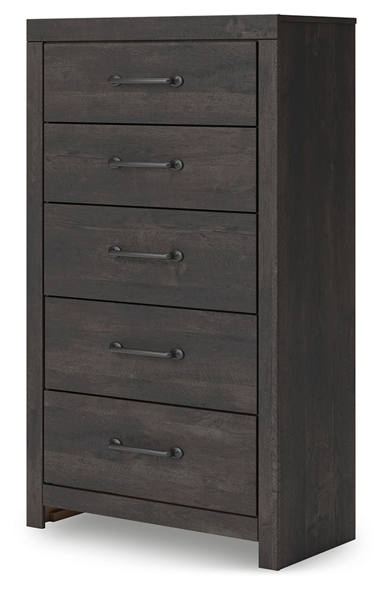 This chest of drawers puts a casually chic twist on everyday function. Its rustic charcoal finish pairs well with other neutrals and pops of color alike, giving you the flexibility to change up your aesthetic as you please. Smooth-gliding drawers keep clothes and bed linens stored in style.