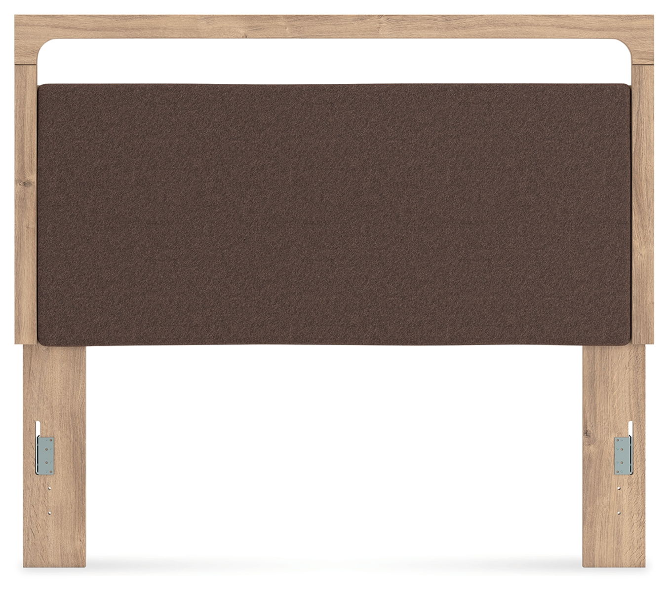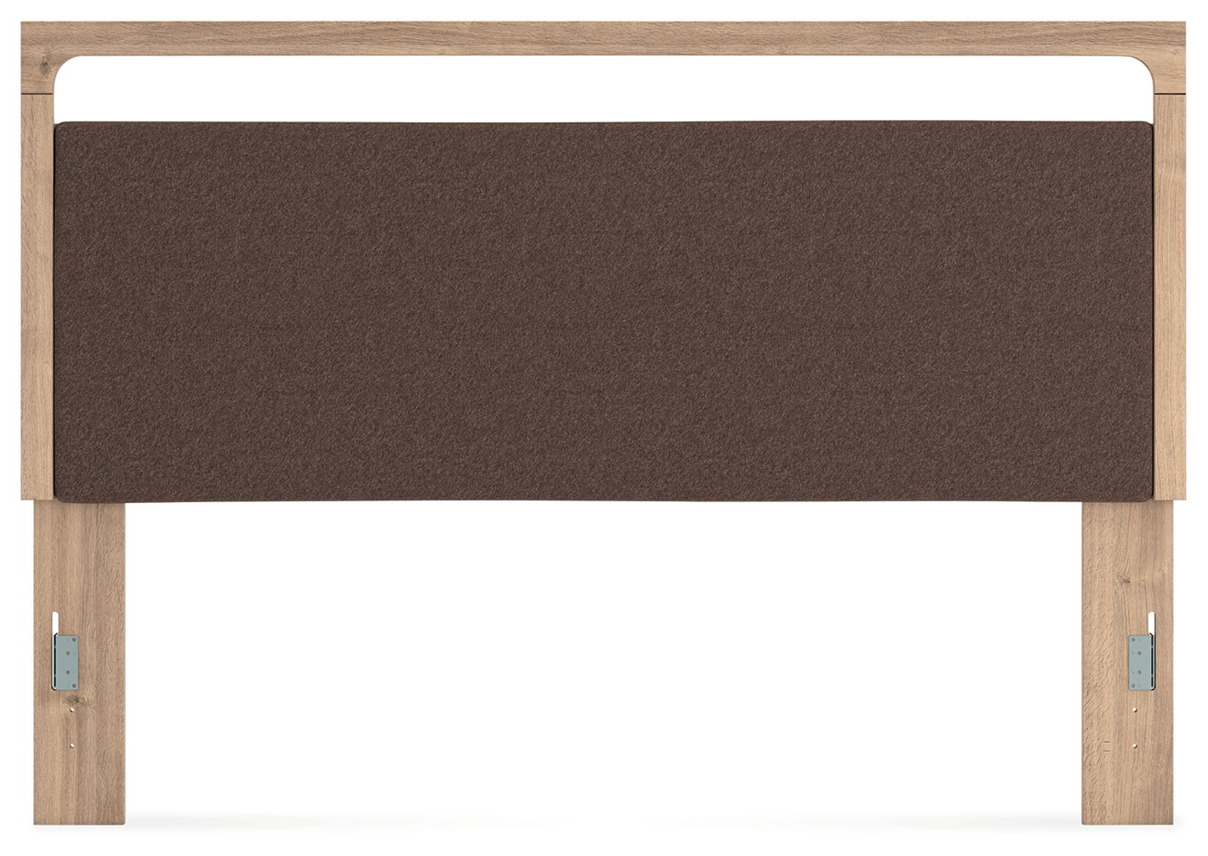 The natural wood tones and clean lines of this upholstered headboard echo your easygoing style sensibilities. With a warm finish and replicated oak grain, its carefree character lightens up your bedroom. Curved inner corner details soften the look, while contrasting brown fabric modernizes the feel. And for added function, warm LED lighting adds serene ambiance at the touch of a button.