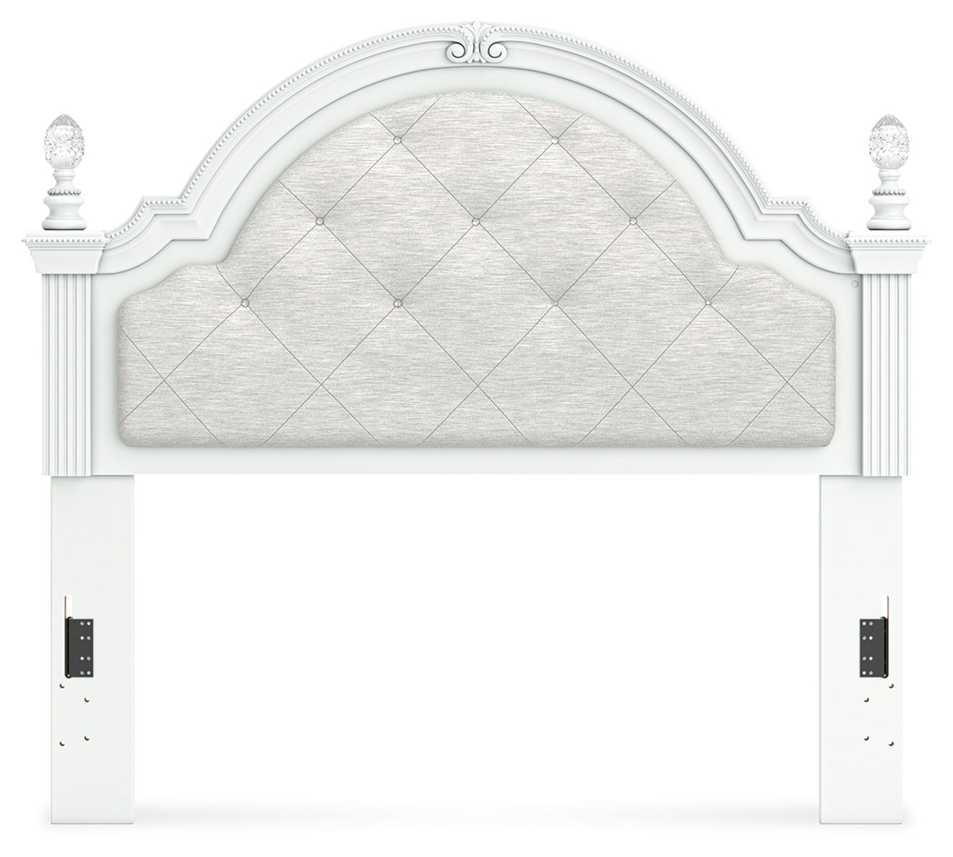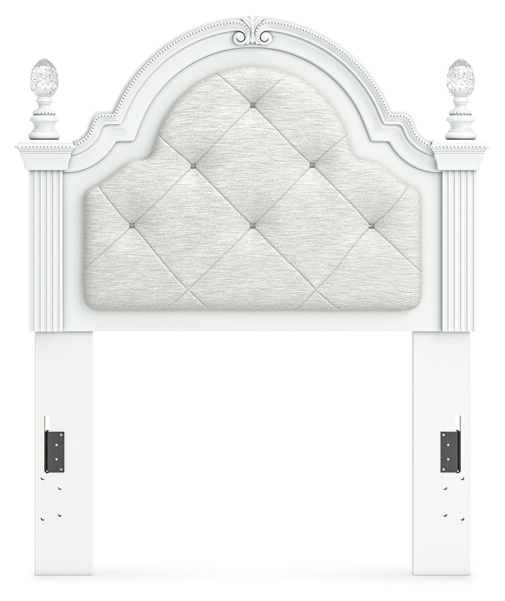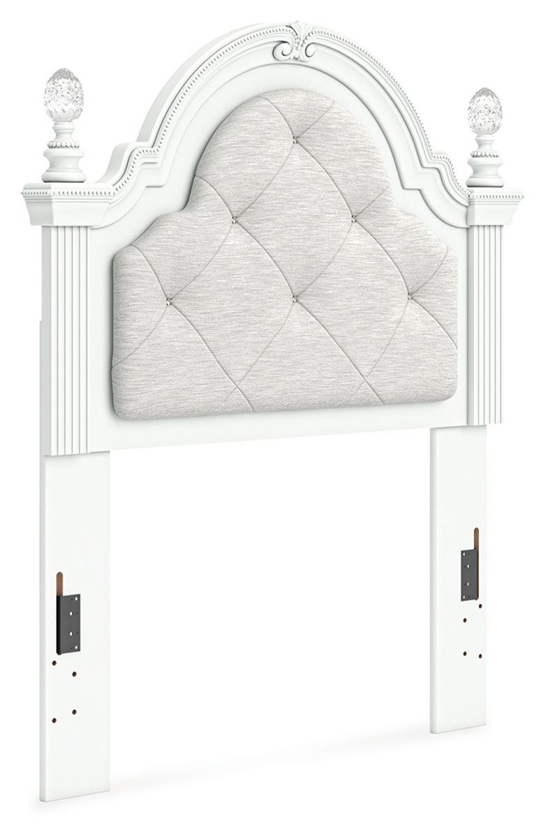 Fit for a princess. This upholstered panel headboard’s crisp matte finish pairs with charming ornate beading and sumptuous button-tufted upholstery—perfect for your girly girl. Decorative ball tops and multicolored LED lighting are the crowning touches to make your little one feel like royalty.