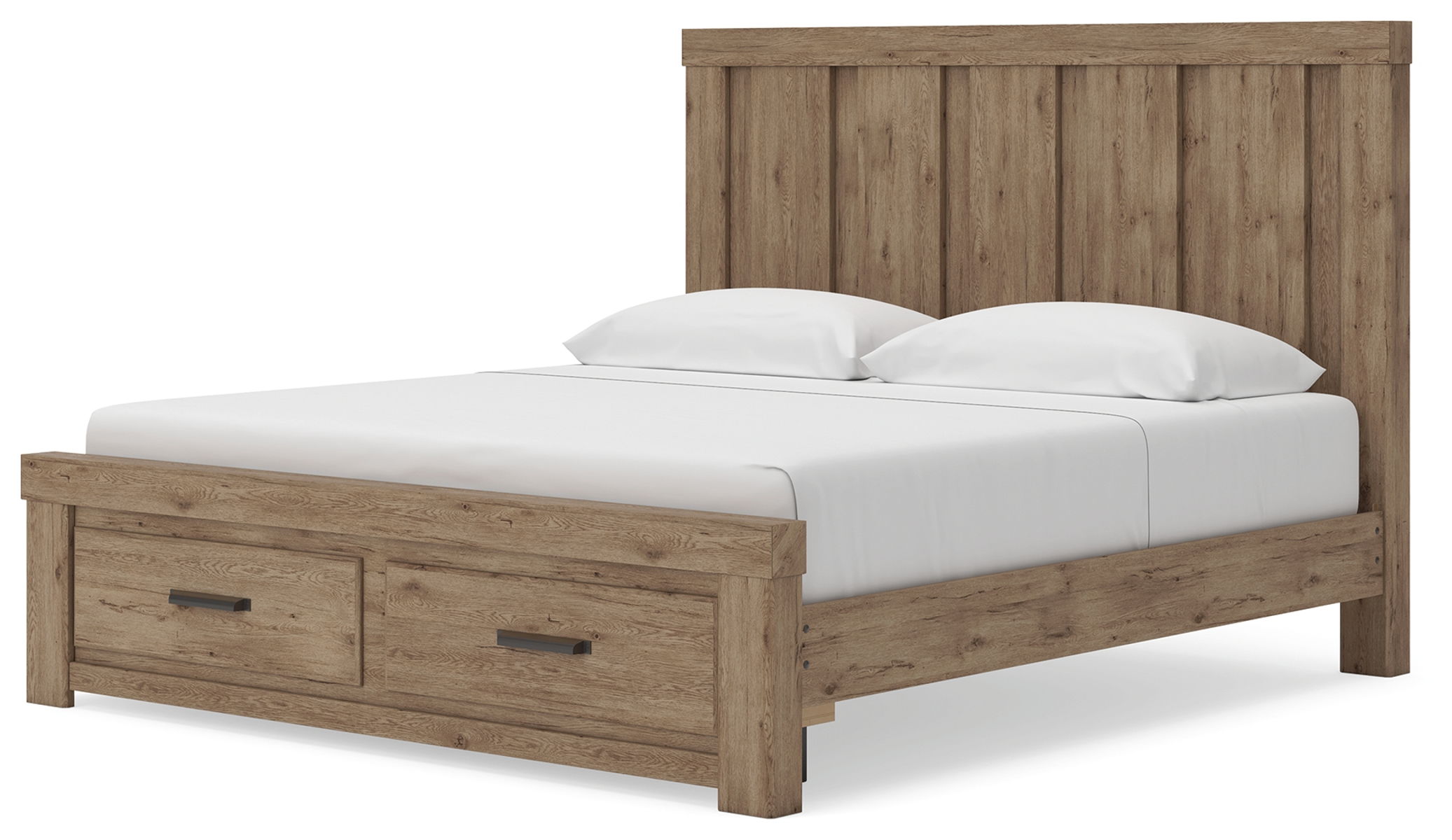This panel storage bed delivers a fresh, trend-right spin on rustic design. Its wood tones, minimal lines and dimensional detailing create a look that’s effortlessly chic yet grounded in authenticity. Seamlessly incorporated drawers hold essentials with ease. Complete with log-look accents capping the headboard and footboard, this bed has a substantial style that feels timeless.