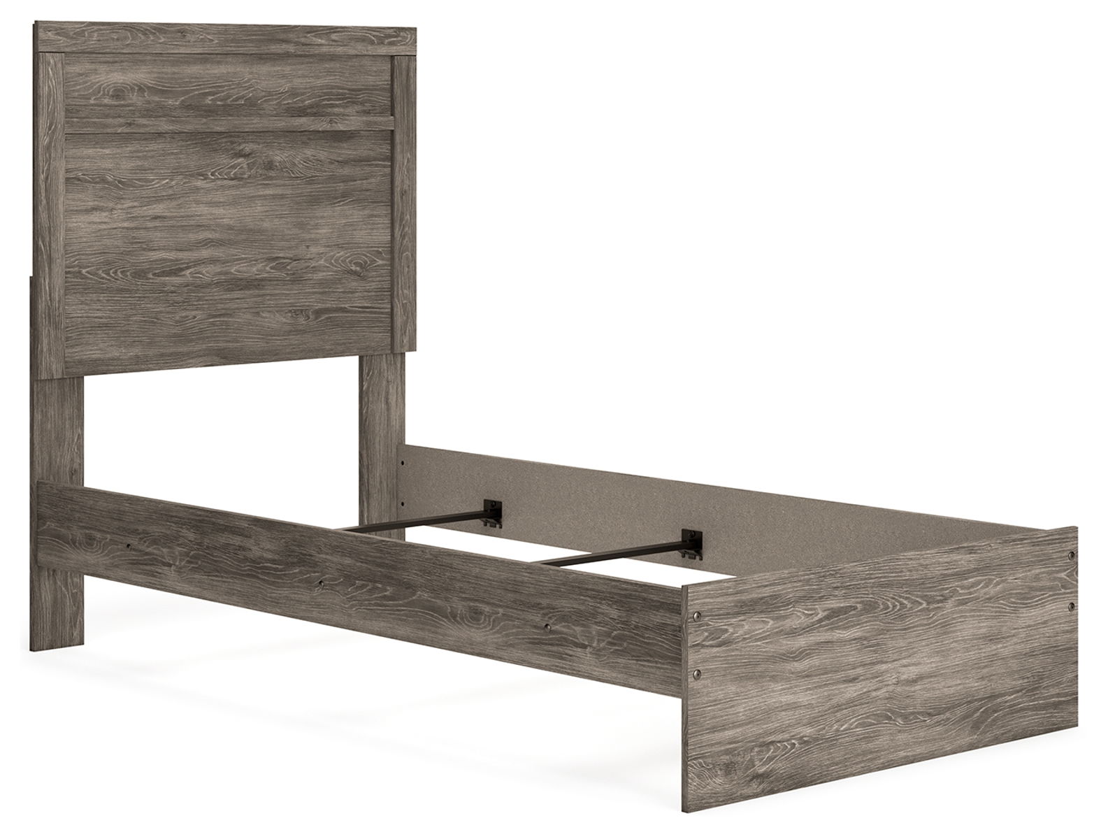 Rustic warm gray finish over replicated Oak grain with authentic touch. Large dark pewter color handles with an aged appearance accent cases. Drawer interiors lined with a replicated linen design for a clean, finished look. Side roller glides for smooth operating drawers. Mouldings across headboard give a thick planked look.