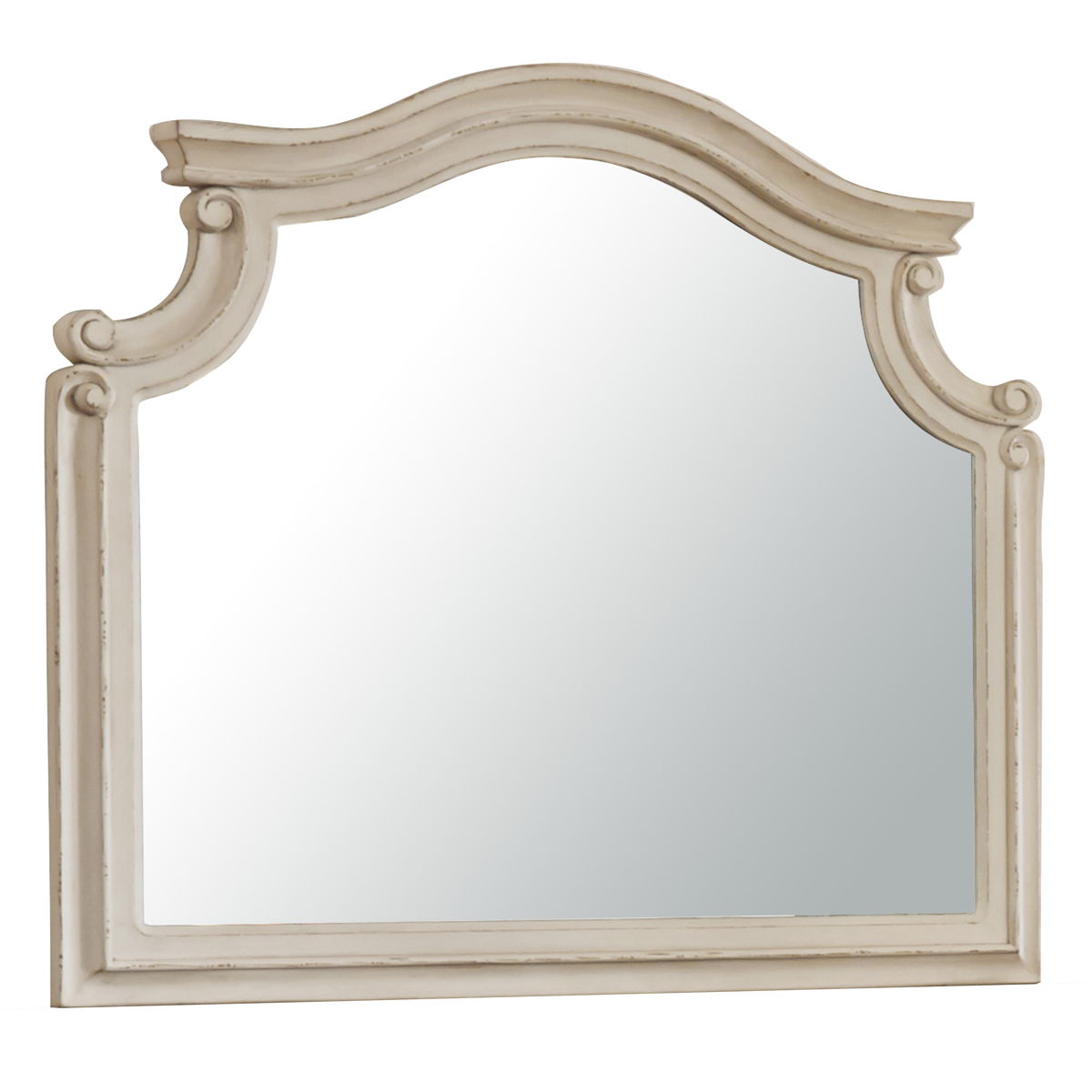 Traditional cottage design. Antiqued two-tone finish featuring chipped white cases with distressed wood finished tops. Tops feature Oak veneers, while the cases are made with engineered wood substrates and Poplar solids. Framed drawer fronts and overlay decorative corbels dress the cases nicely. Ornately shaped headboard with inset upholstered cushion and matching mirror frame. Dovetail drawer construction with ball bearing side glides. B743-93 night stand features an AC power supply with dual USB charging ports. B743-22 (3) drawer vanity, mirror, linen colored upholstered stool. Vanity mirror dimension: 28″W x 1″D x 26″H. Vanity stool dimension: 19″W x 14″D x 18″H. B743-54S/56S double storage drawer footboard features ball bearing side glides and cushioned top rail. Storage footboard and side rails are compatible with the in-line headboard. The bench rail is 8’ deep.