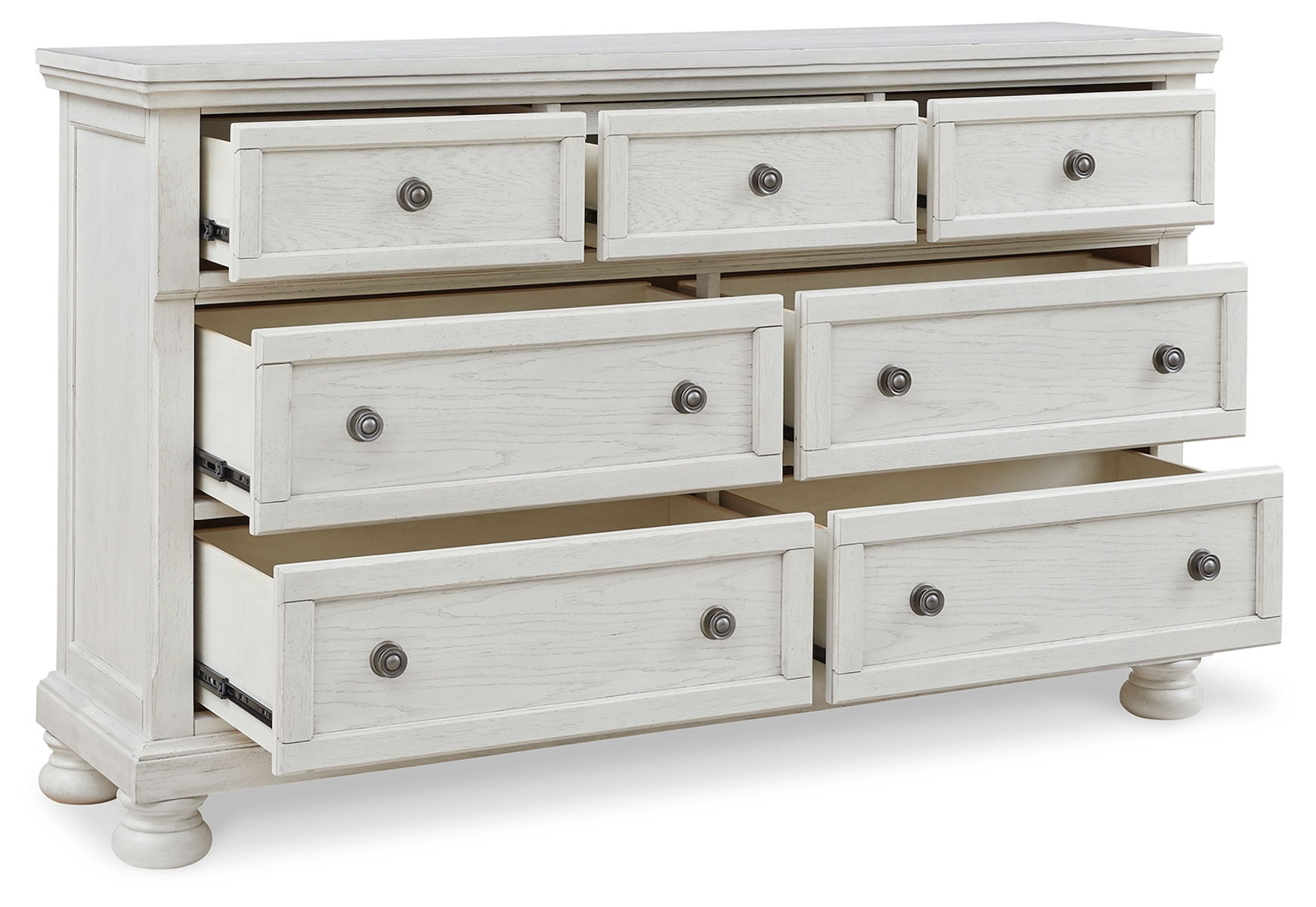 Elegant, timeless furnishings take your bedroom to the next level. Nothing does that better than this set. The antiqued finish with a wonderful grain texture radiates sophistication, while the dark bronze-tone hardware adds an ornate touch to the handy storage drawers. Timeless traditional design. Made with select Oak veneer, MDF and solid wood components. Antique finish with a wonderful grain texture. Dovetail drawer construction with metal ball bearing side glides and dark bronze-toned knobs.