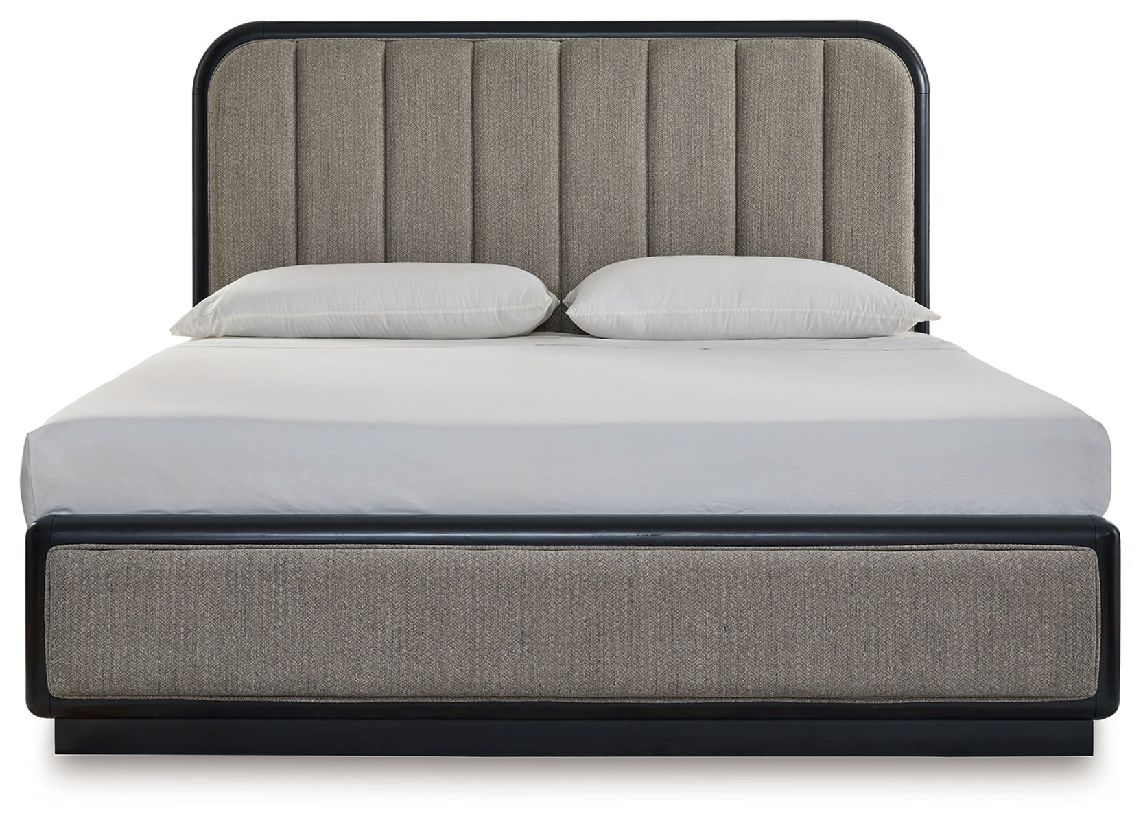 Inspired by art deco design, this softly shaped upholstered panel bed makes a lasting impression in a simply stunning way. Its magnificent curved silhouette is enhanced by a rich layered finish on the textured wood grain surface. The channeled vertical headboard and footboard, wrapped in herringbone textured upholstery, merge form and function. This is the statement piece you’ve been dreaming of to elevate your contemporary inner sanctum.