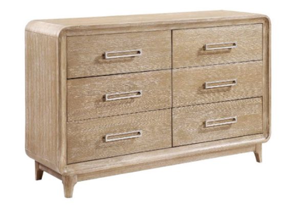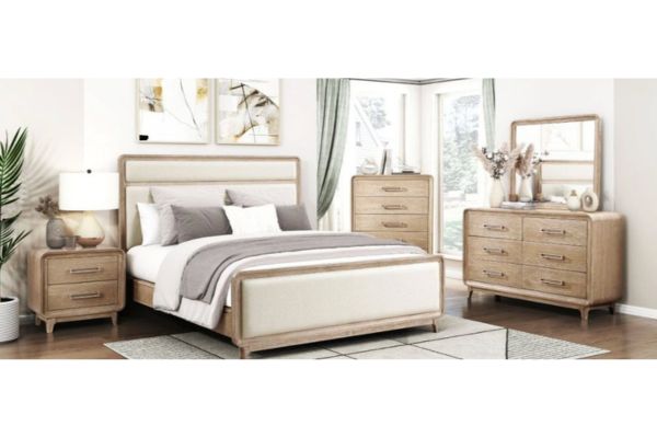 Discover rustic elegance and contemporary comfort with our bedroom collection. Crafted from a durable blend of oak veneer, solid wood, and engineered wood, each piece ensures lasting stability. The collection features beds (available in California King, Eastern King, and Queen sizes) with plush chenille upholstered headboards and footboards, creating a luxurious focal point. Complement your space with the two-drawer nightstand, six-drawer dresser, and five-drawer chest, all featuring smooth ball-bearing glides, sturdy dovetail joints, and refined antique nickel-tone bar pulls for effortless organization. Complete the look with the elegantly framed mirror, enhancing light and adding sophisticated charm. This collection seamlessly blends style and practicality, offering a serene and inviting sanctuary for your home.