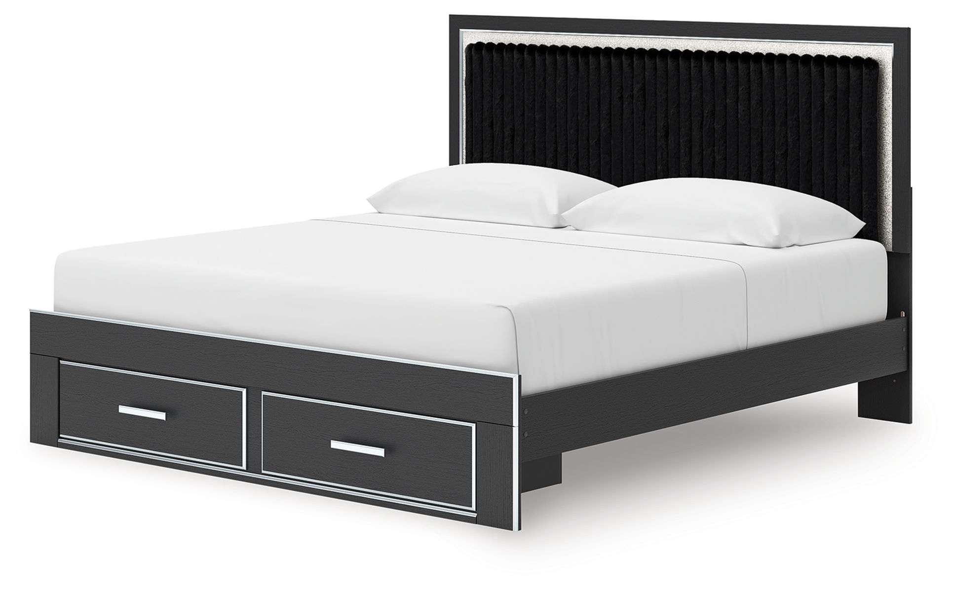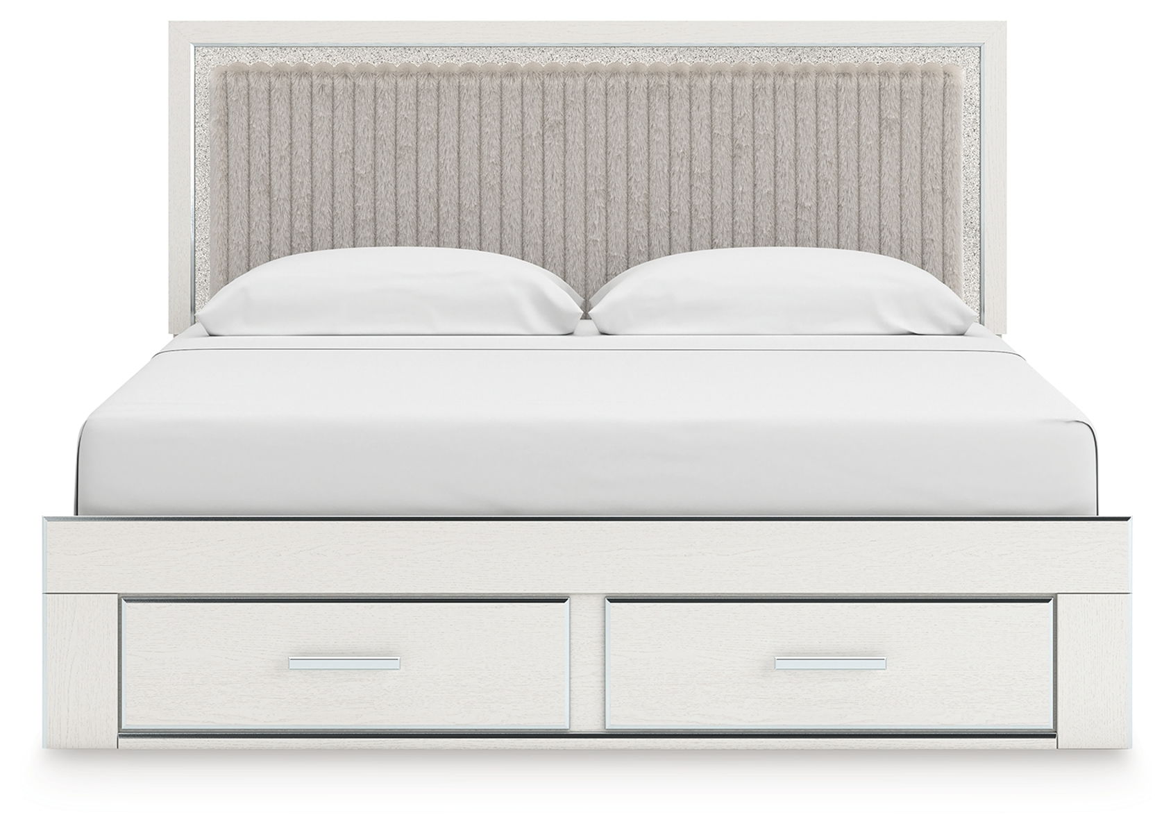 If glitz and glam are your jam, you’re gonna love this king upholstered panel storage bed. Gleaming glitter and dazzling chrome-tone touches are paired with tufted faux fur for a stunning pop of pizzazz. And the spacious storage drawers, with large-scale handles and faceted details, don’t disappoint. Loaded with chic flair and serious sparkle, it’s a simply splendid way to wake up your inner sanctum’s style.